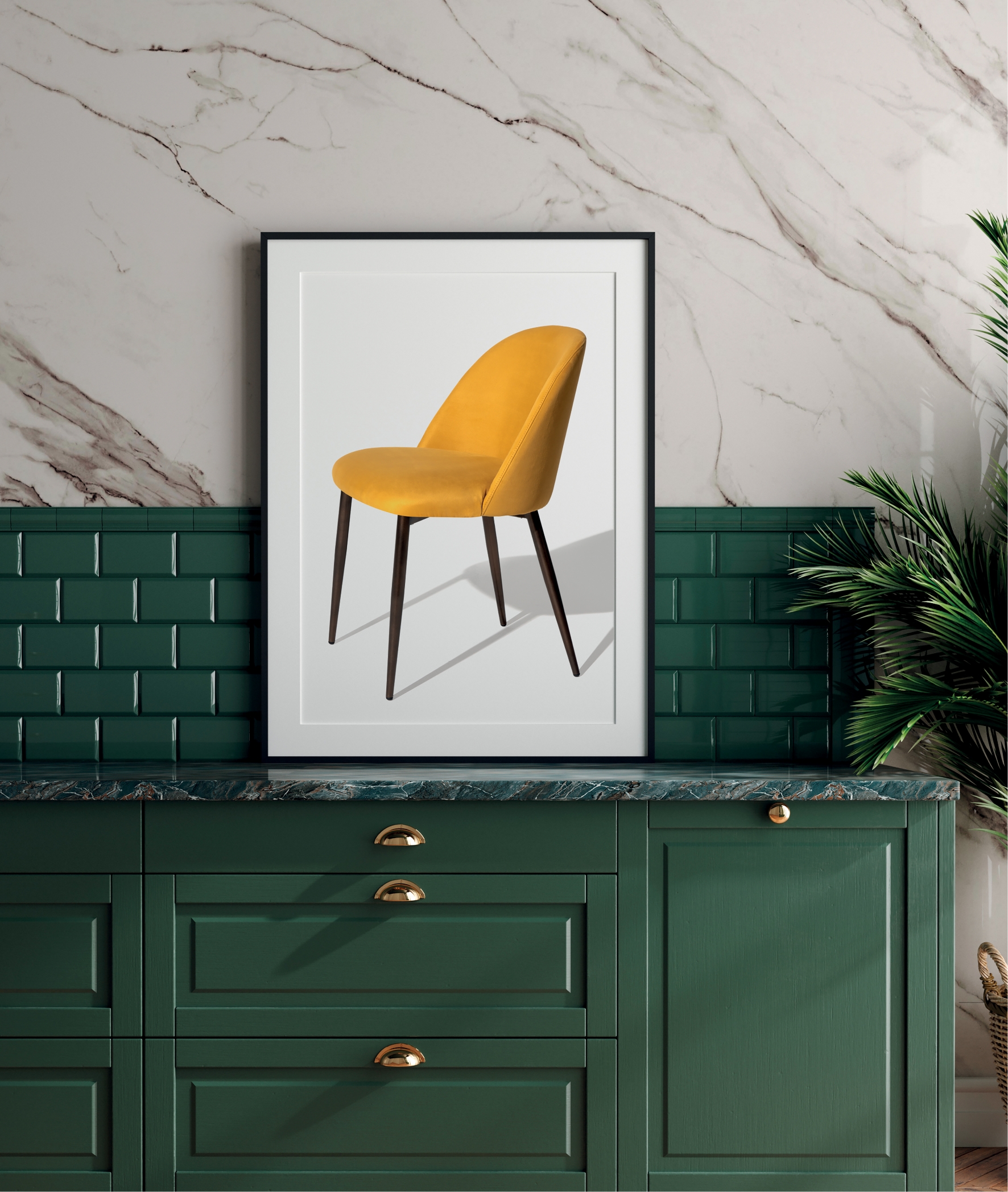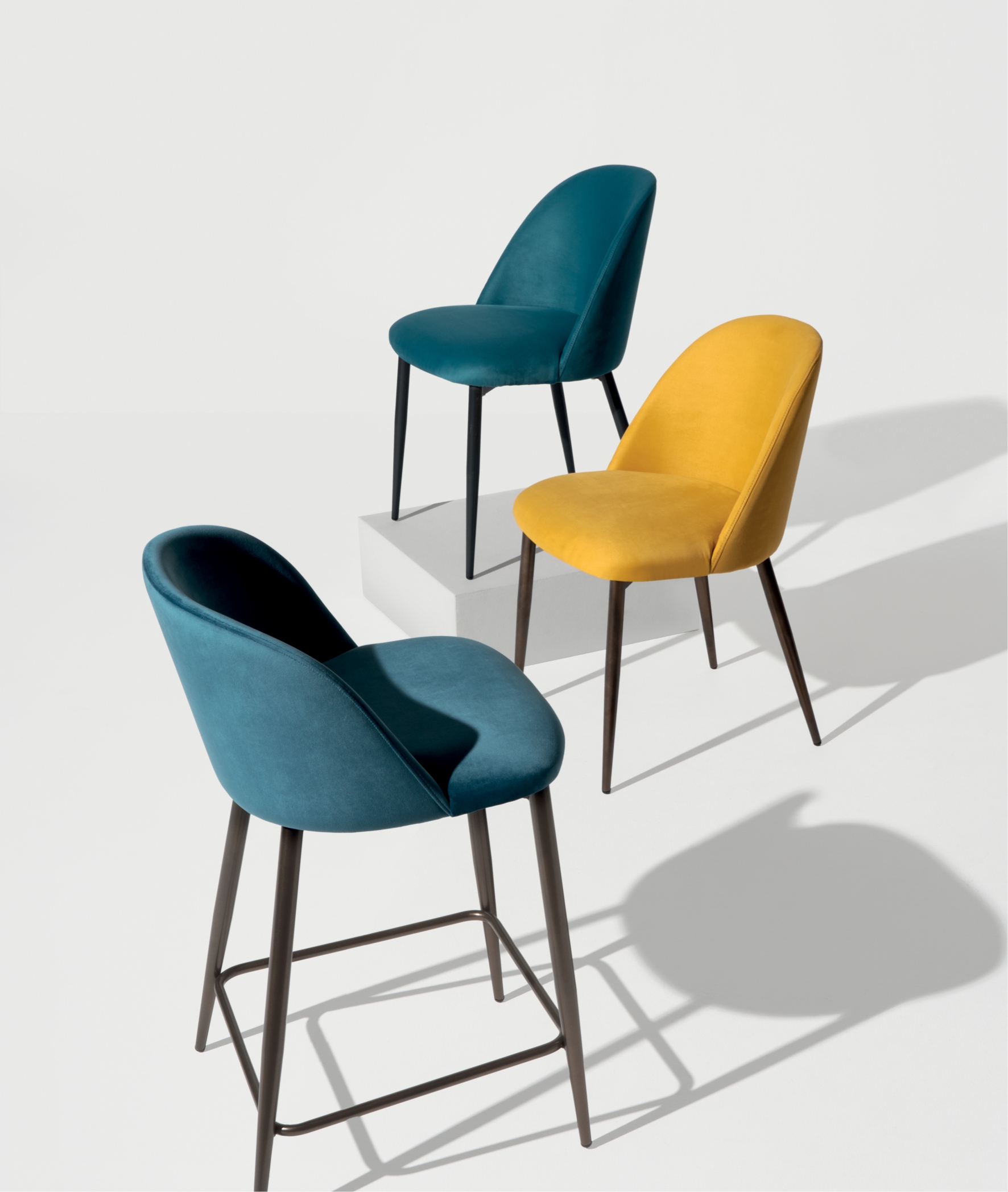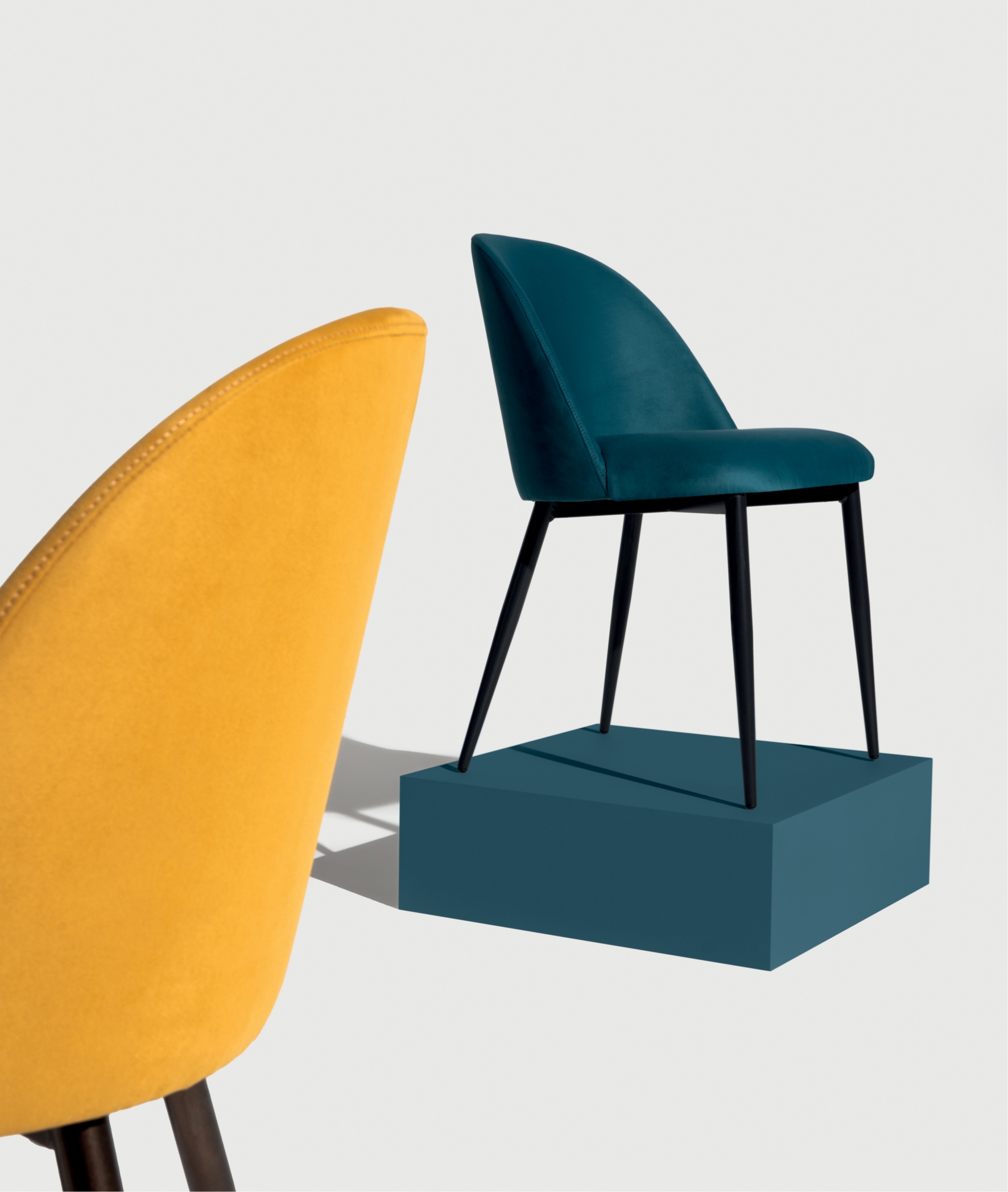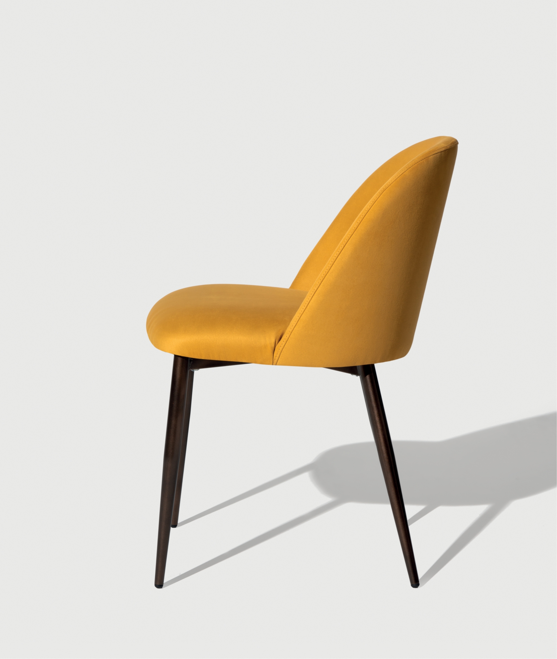 Sedia con base con quattro gambe coniche in metallo verniciato. Seduta e schienale rivestiti in tessuto o similpelle. Possibilità di personalizzazione su richiesta cliente.