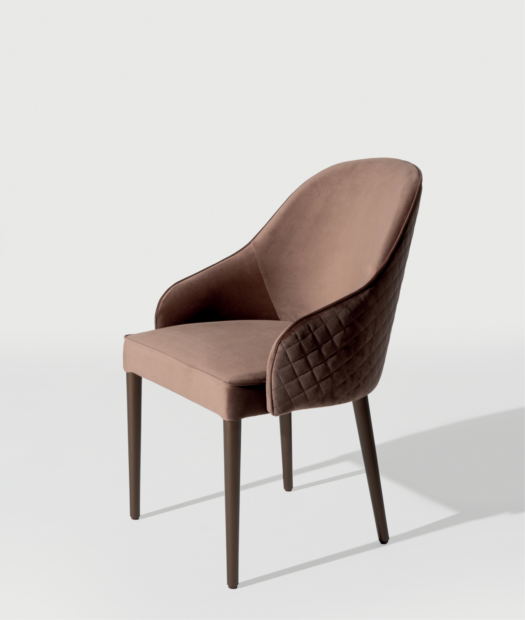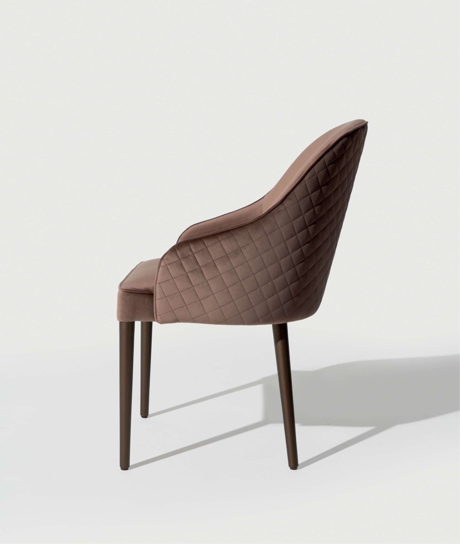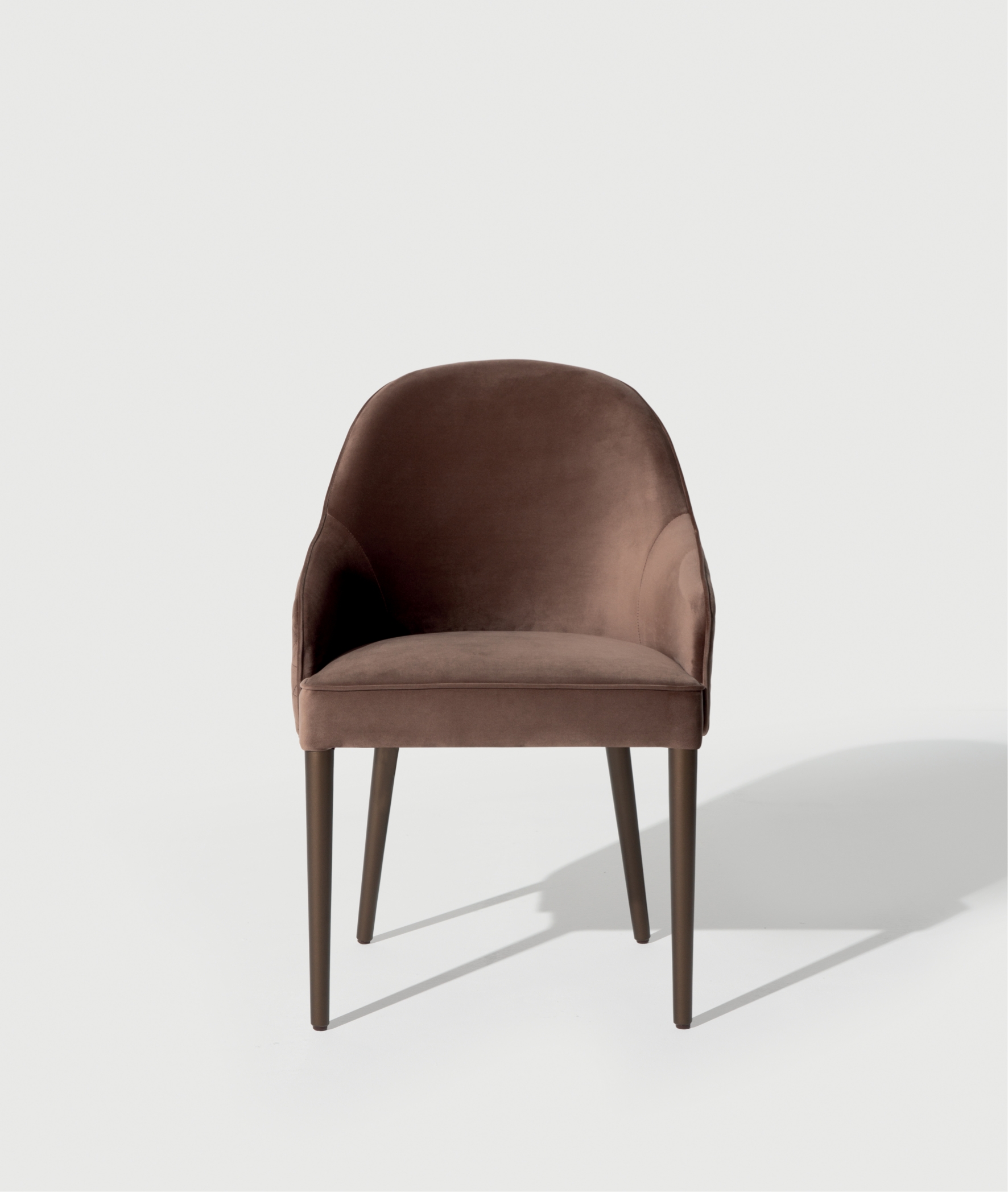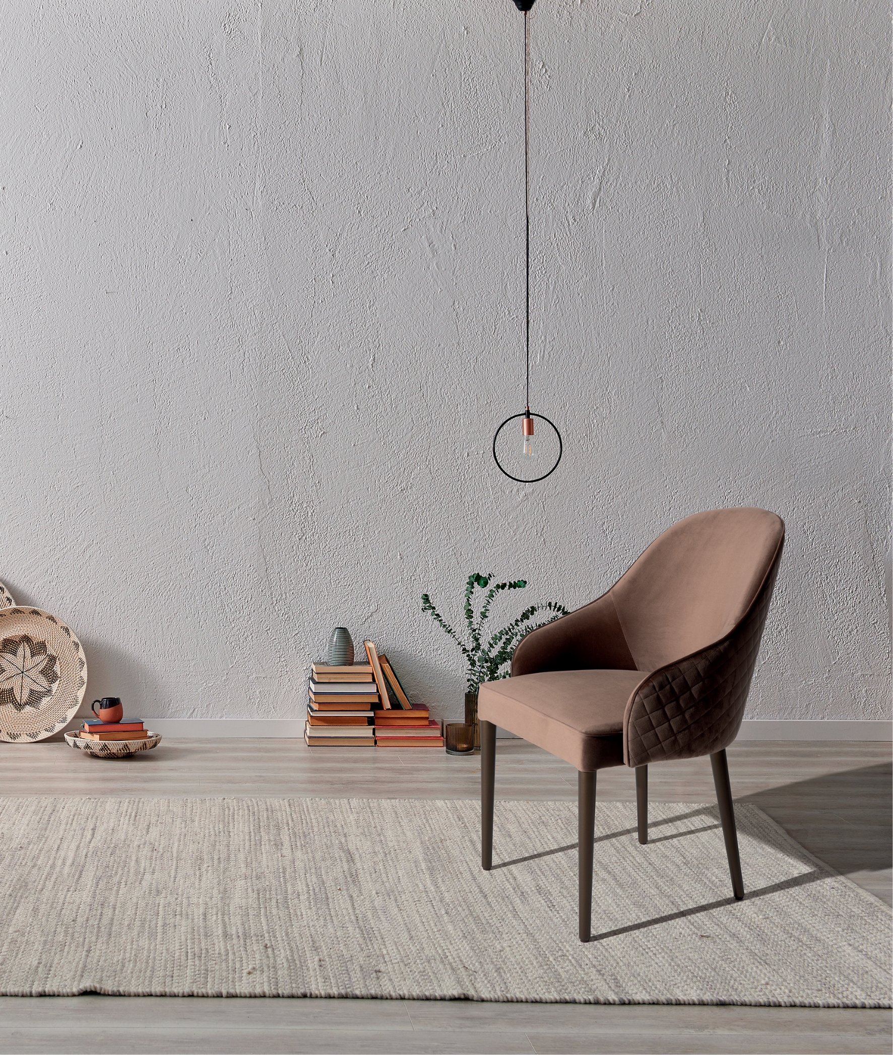 Poltrona con gambe in legno di faggio verniciato con variante di bicchierini verniciati oro. fusto imbottito in tessuto o similpelle. Possibilità di personalizzazione su richiesta cliente.