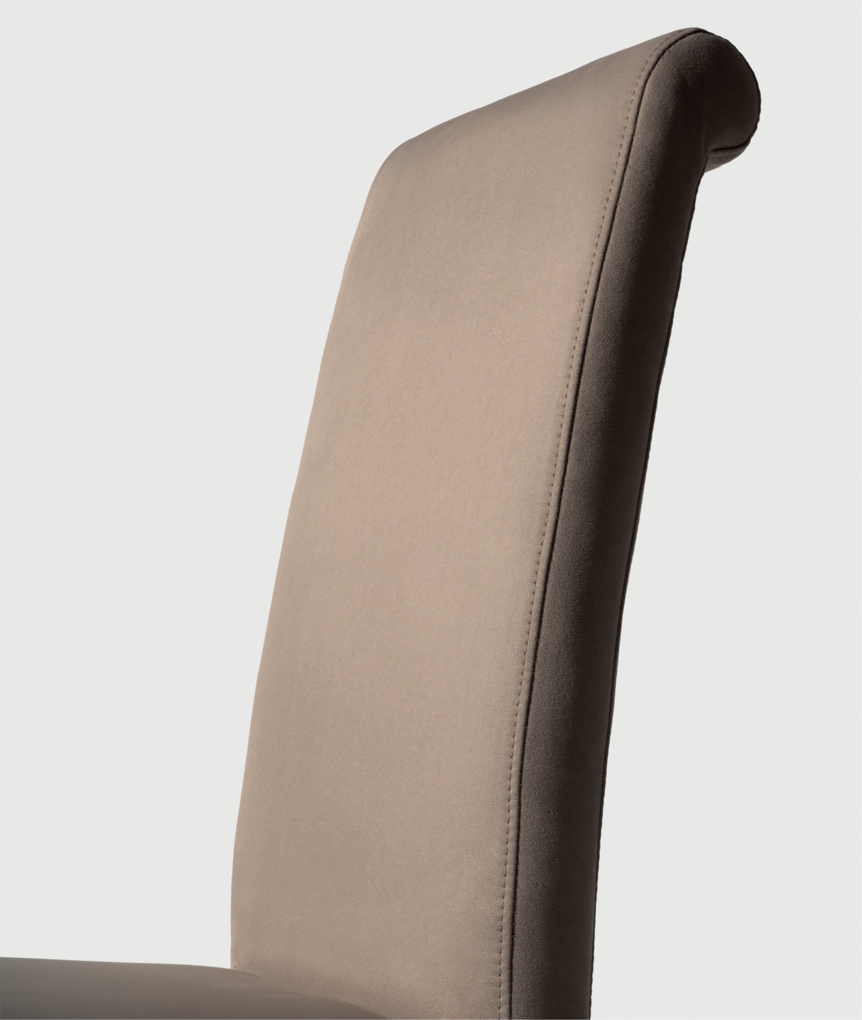 Sedia con gambe in legno di faggio verniciato, fusto con particolare sagomatura sopra schienale a forma di riccio, imbottito in tessuto o similpelle. Possibilità di personalizzazione su richiesta cliente.
