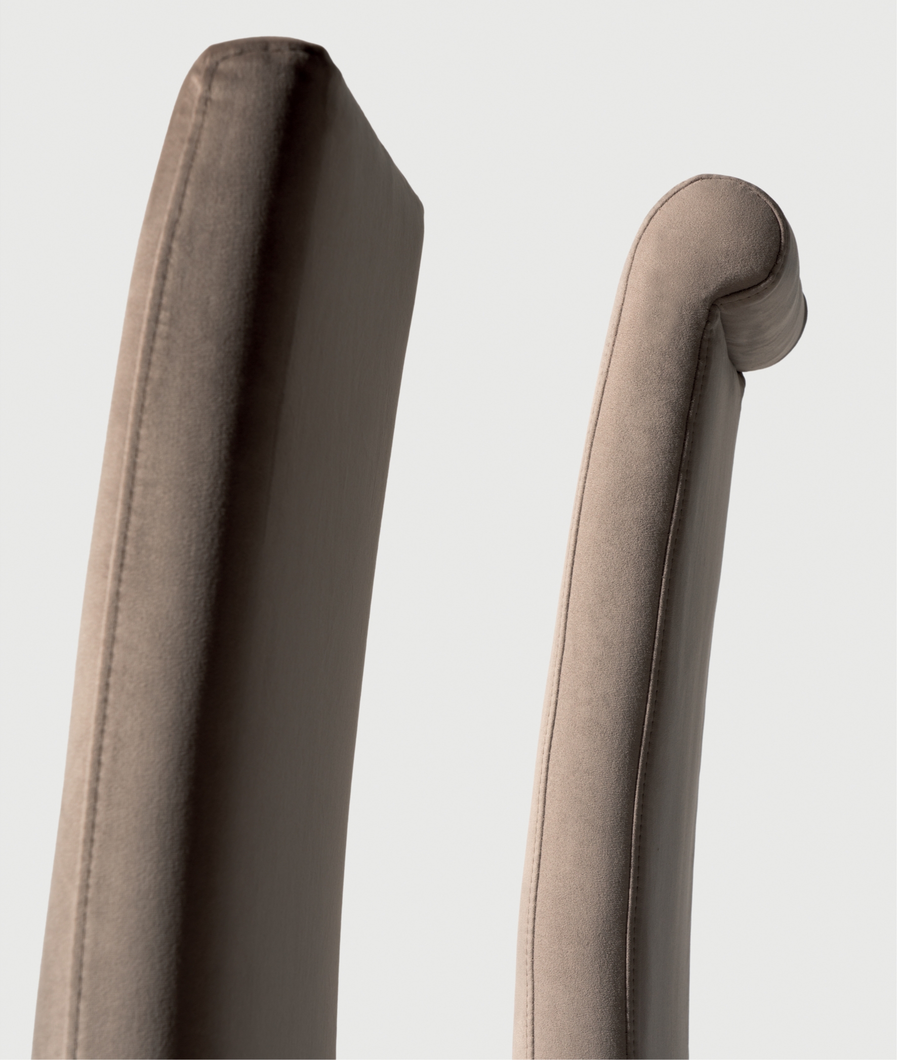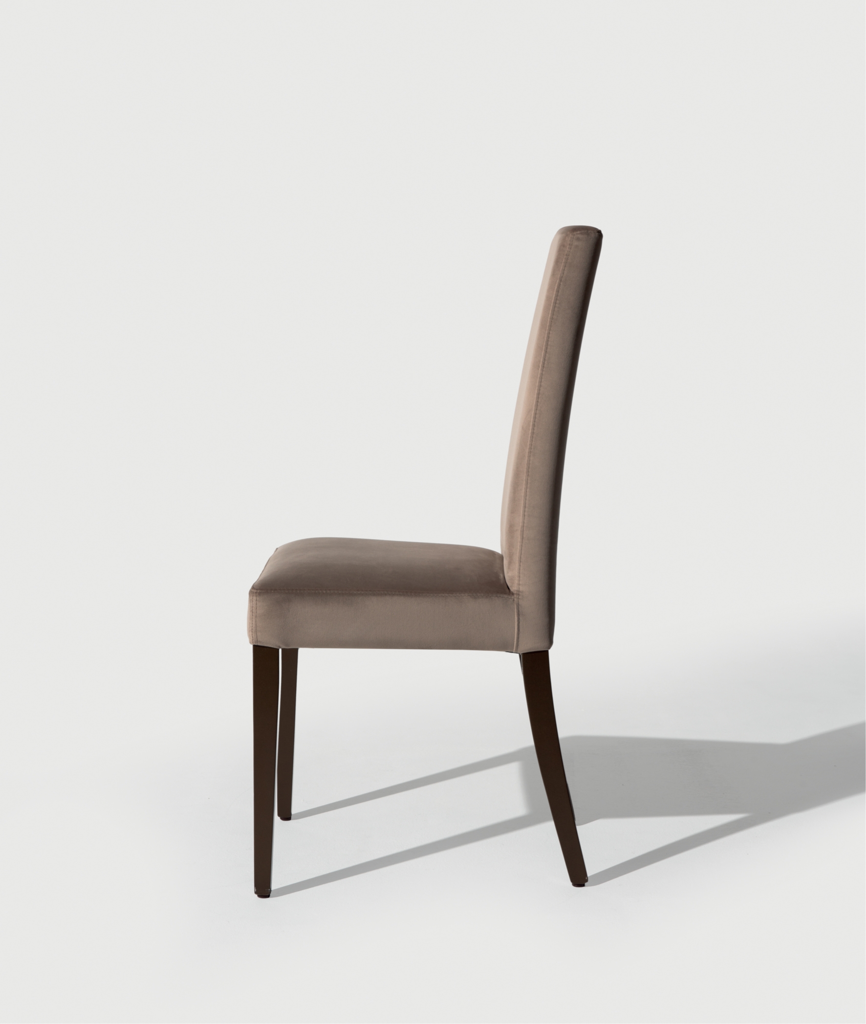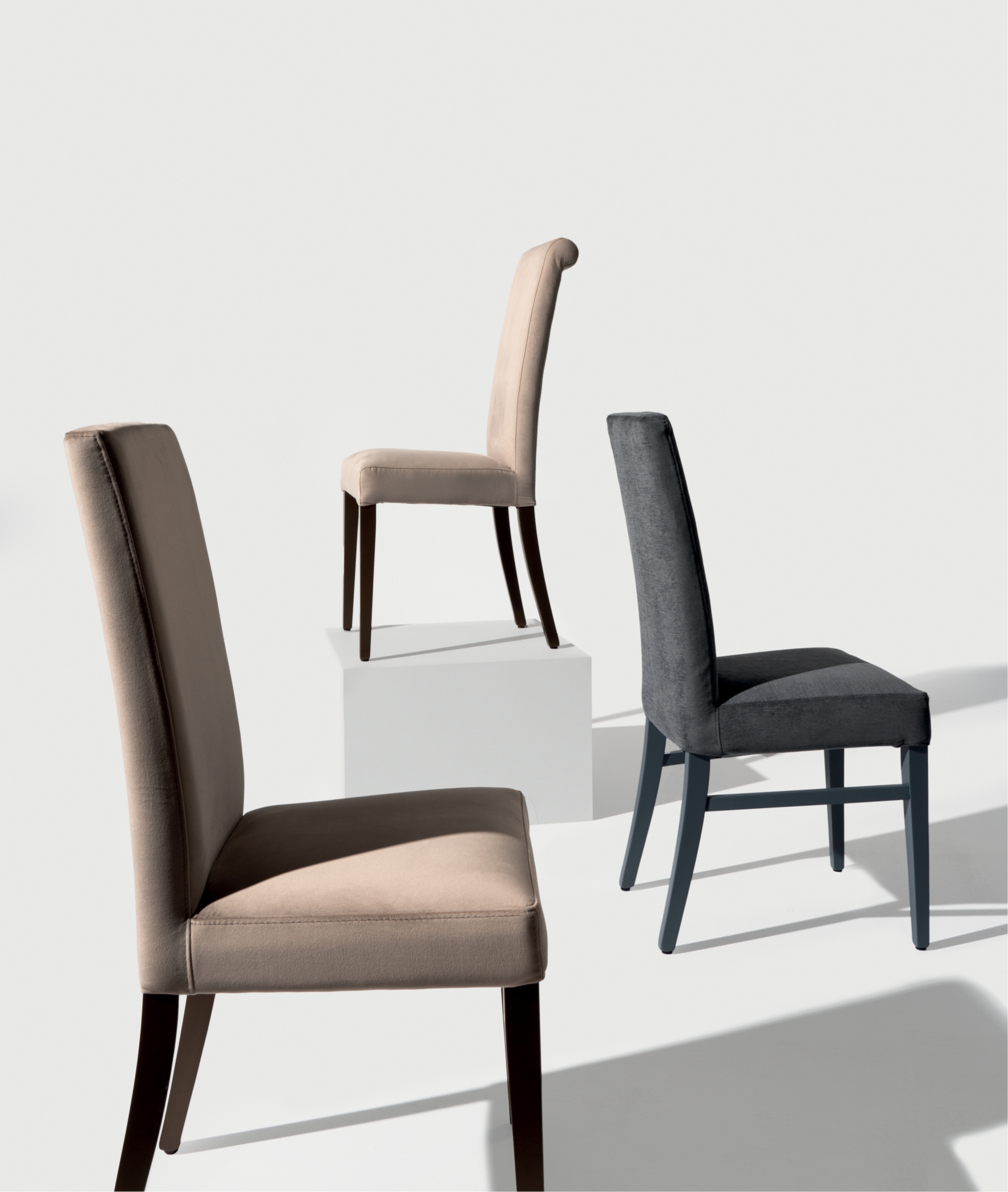 Sedia con gambe in legno di faggio verniciato, fusto imbottito in tessuto o similpelle. Possibilità di personalizzazione su richiesta cliente.
