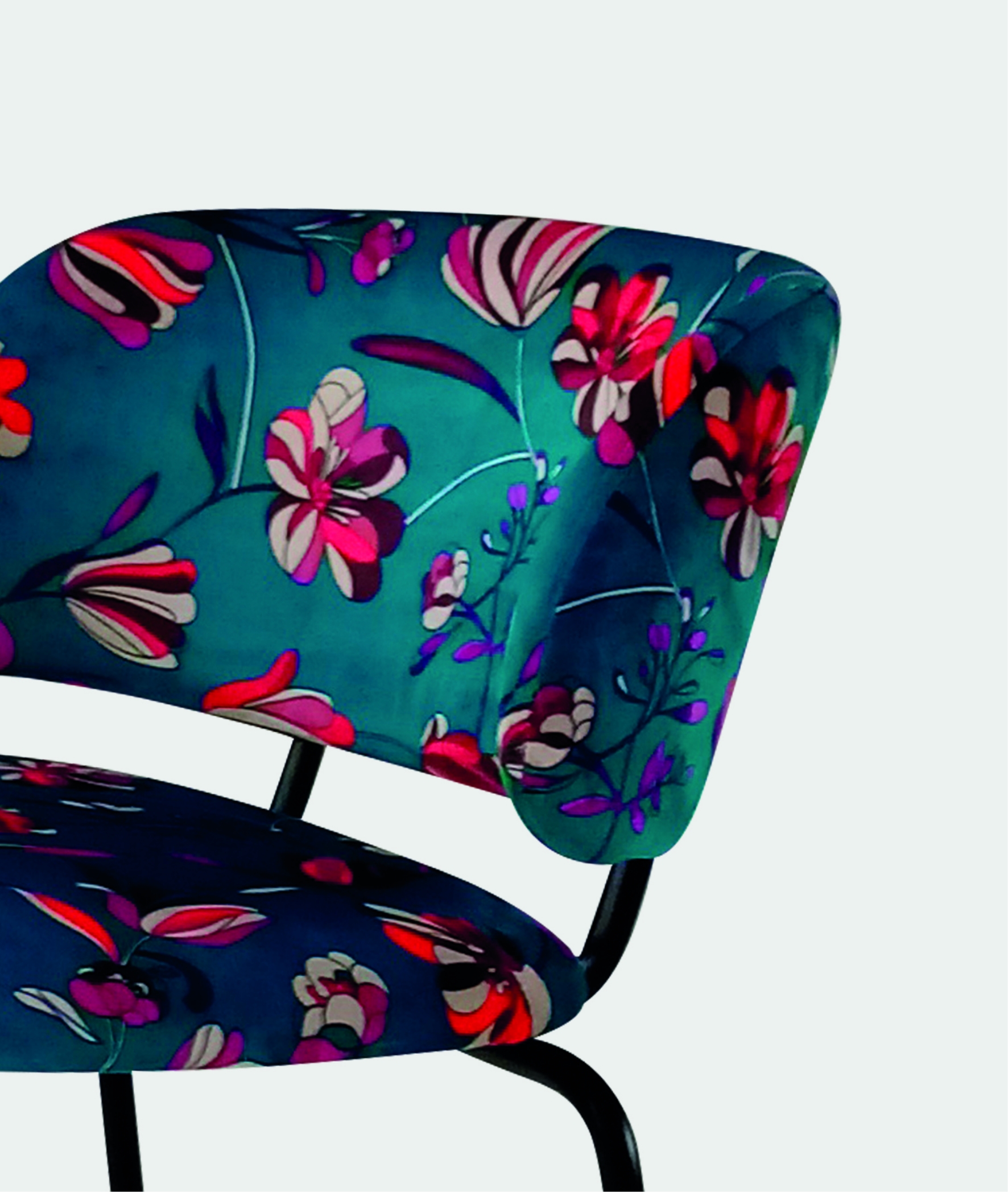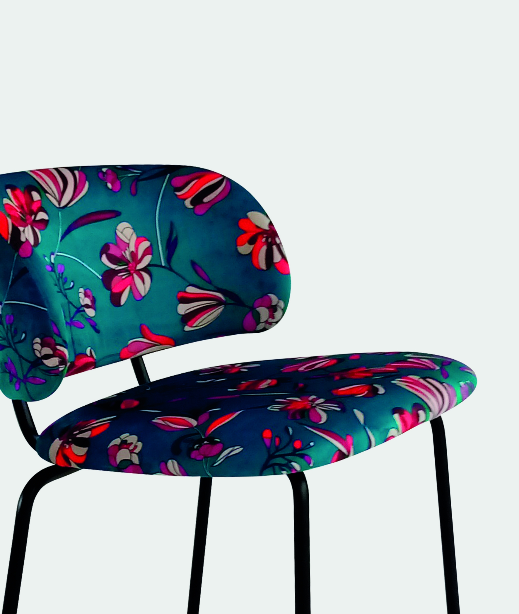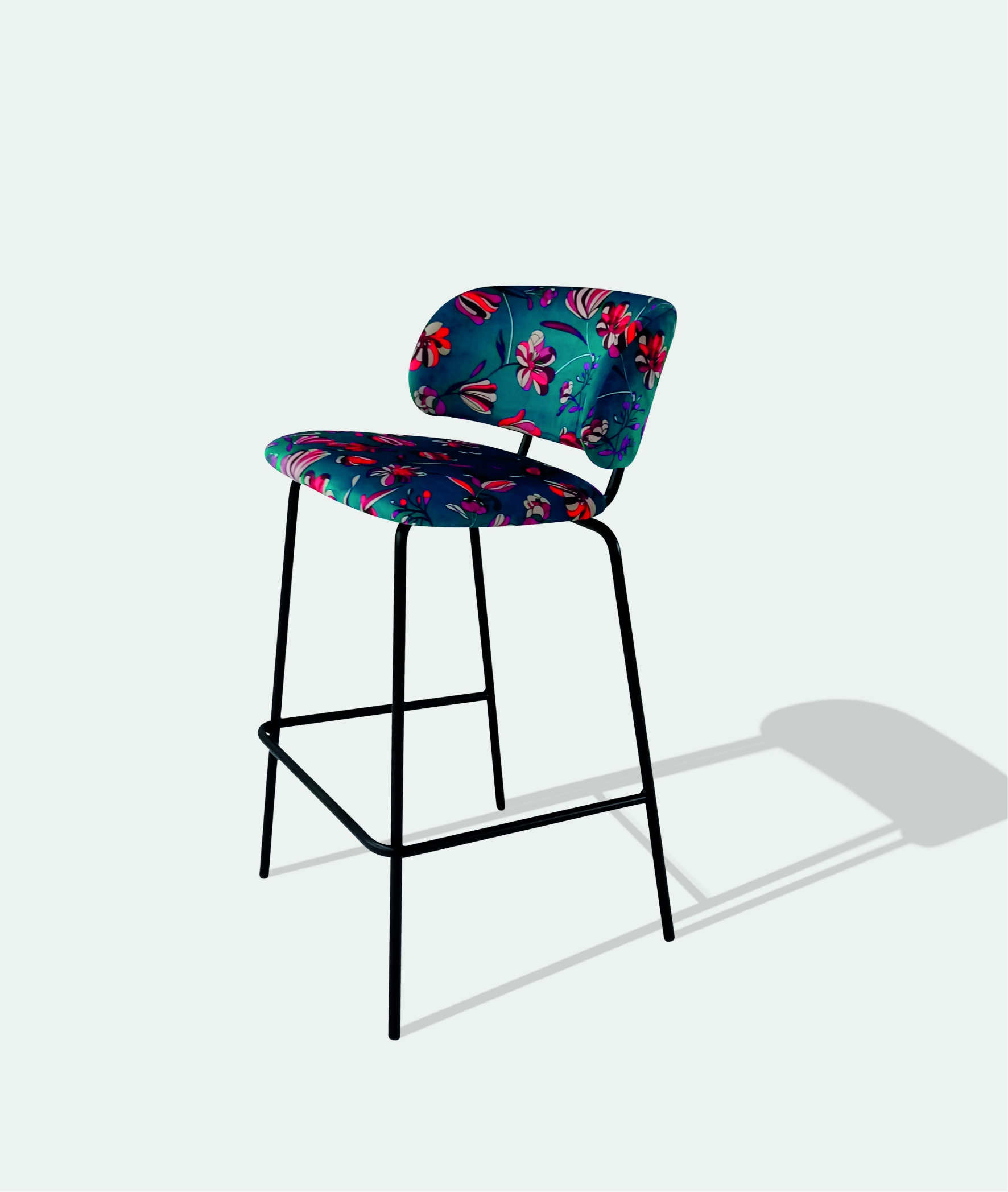 Sgabello in metallo verniciato. Seduta e schienale rivestiti in tessuto o similpelle. Possibilità di personalizzazione su richiesta cliente.